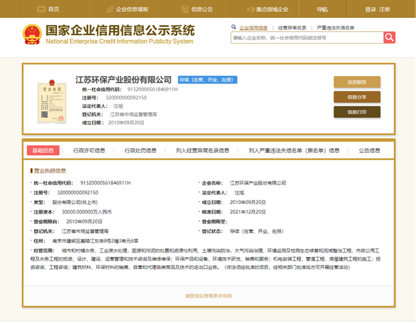 發布日期:2022-04-26 13:03 來源:江蘇環保產業股份有限公司 字體:[ 大 中 小 ] 一、工商注冊登記等企業基本信息